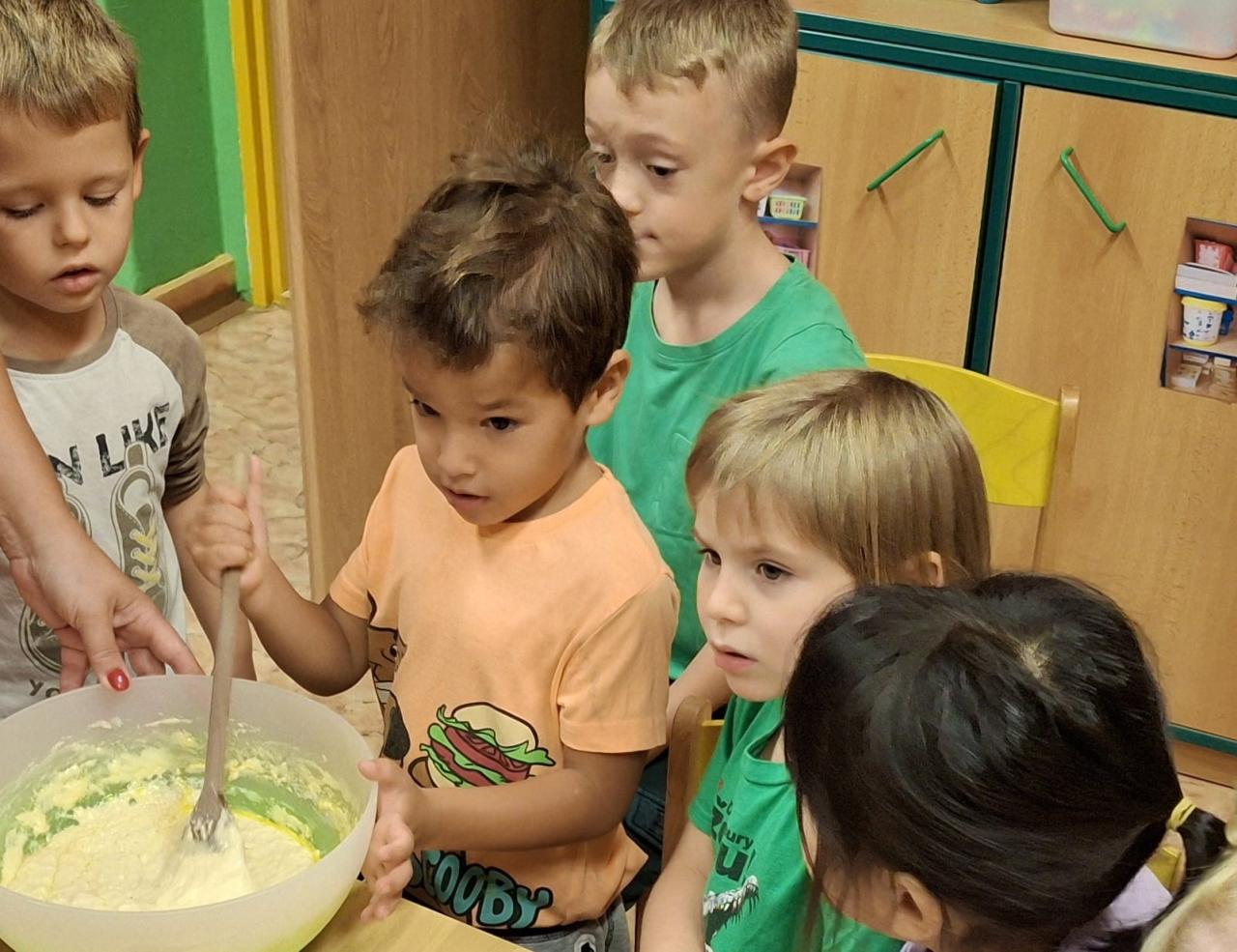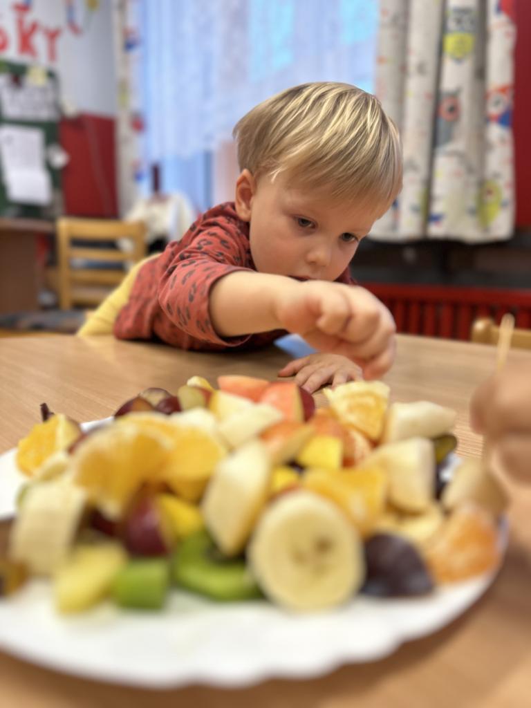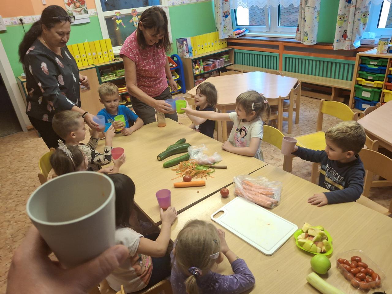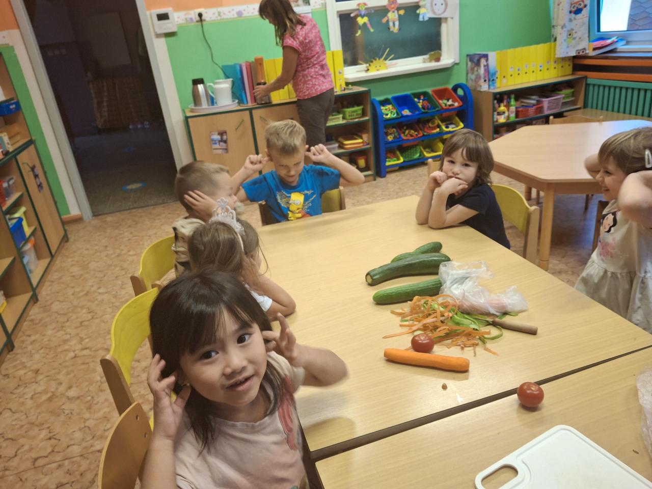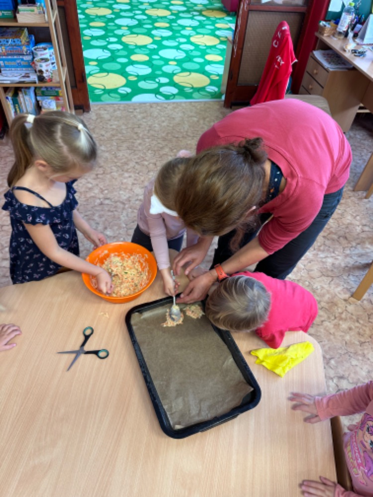 taštičky. V pátek nechyběla ochutnávka čerstvého ovoce, ale i výroba křížal a rozinek. Další týden přišla na řadu zelenina. Sluníčka zvládla pečení mrkvových sušenek a Berušky pizzu, bramborové placky i dipy. V pátek pak nechyběla ochutnávka nejen čerstvé zeleniny, ale i smoothie.