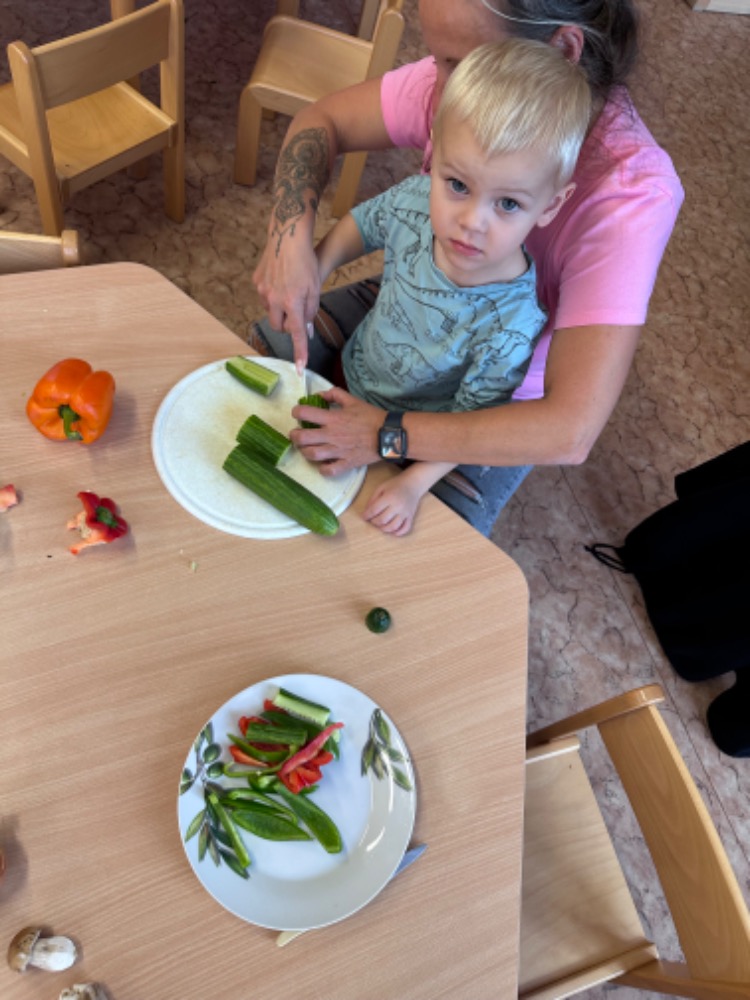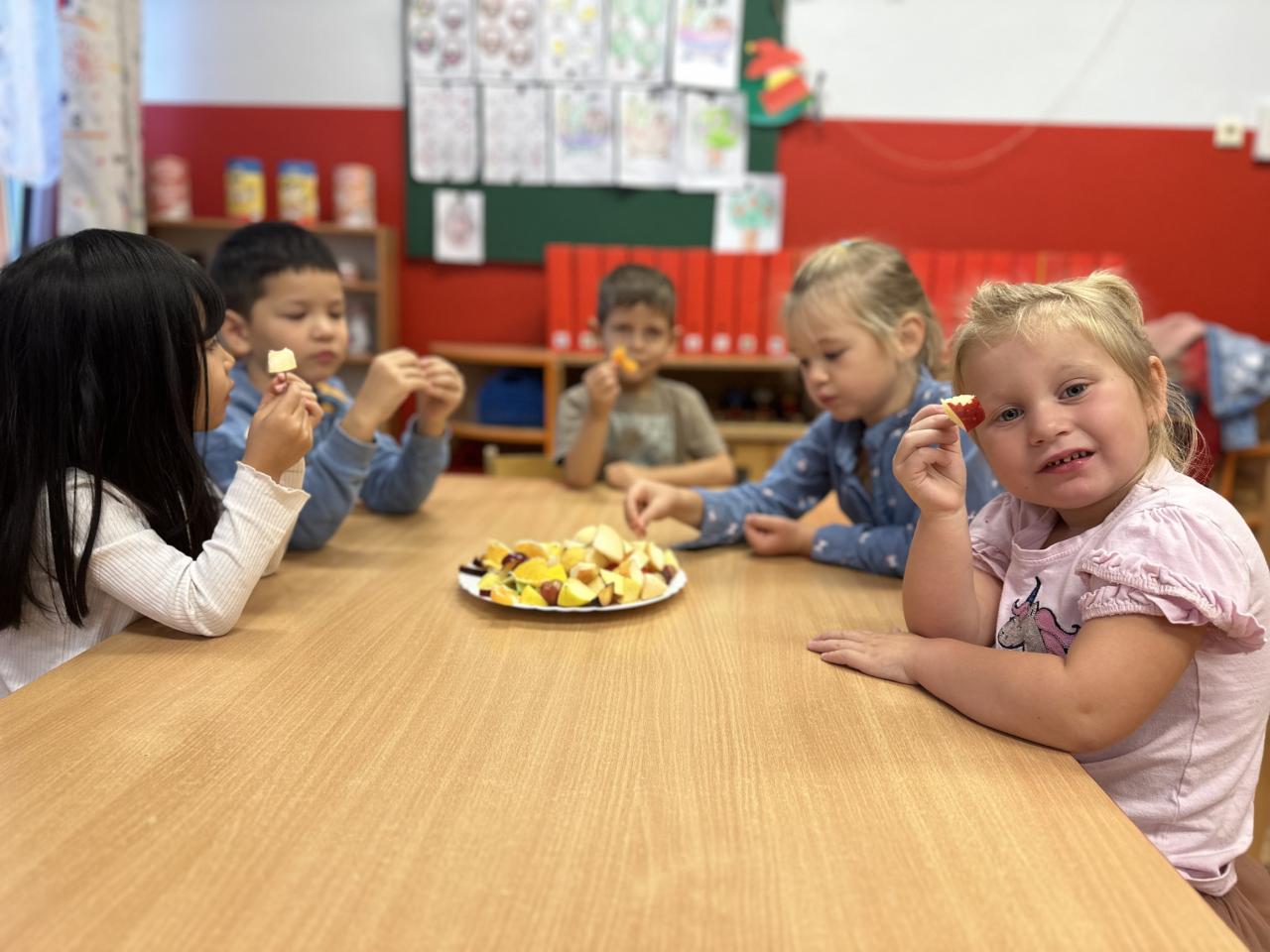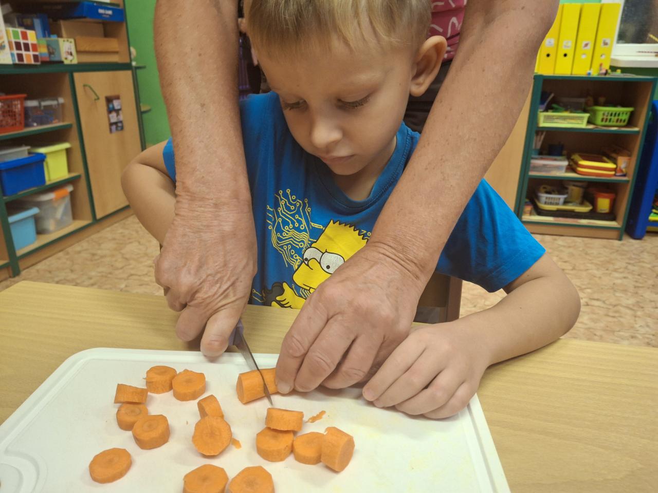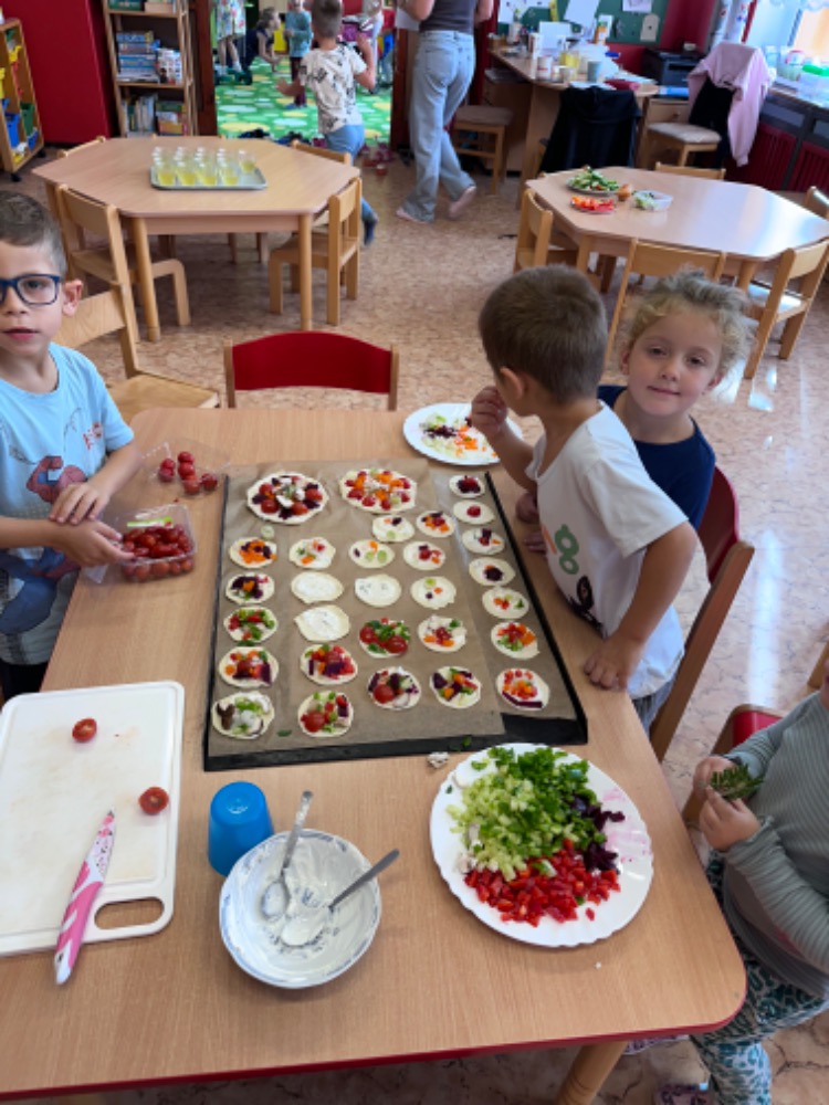 taštičky. V pátek nechyběla ochutnávka čerstvého ovoce, ale i výroba křížal a rozinek. Další týden přišla na řadu zelenina. Sluníčka zvládla pečení mrkvových sušenek a Berušky pizzu, bramborové placky i dipy. V pátek pak nechyběla ochutnávka nejen čerstvé zeleniny, ale i smoothie.
