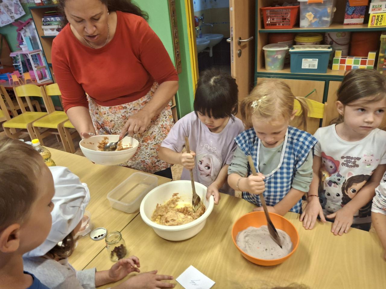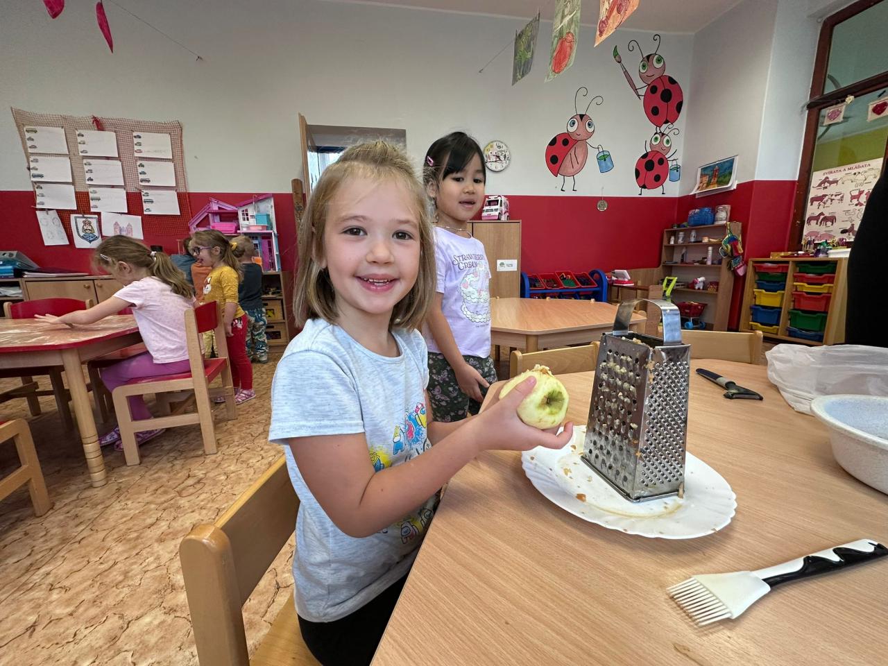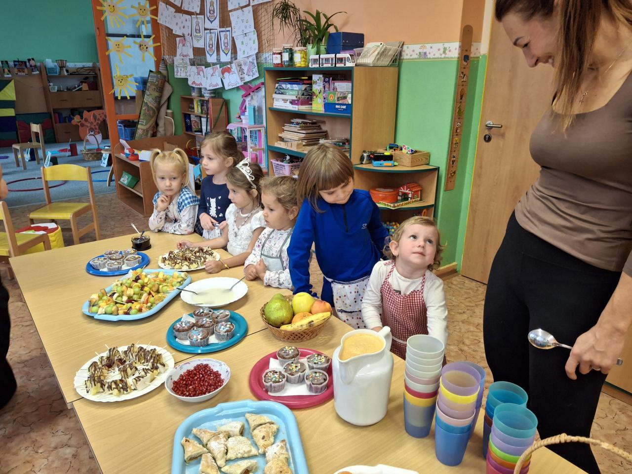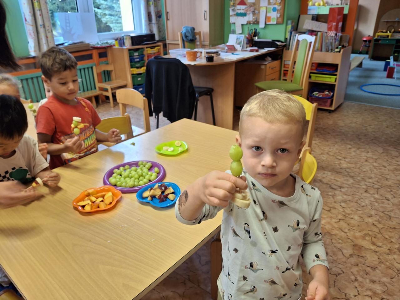 Zdravé bistro. Na občerstvení se velkou měrou podílely samotné děti. Loupaly, strouhaly, krájely, míchaly, zdobily. A nakonec ochutnávaly jablečné mufiny, jablíčkové šátečky, mandarinkový džus, ovocné i zeleninové špízy, zeleninové placičky, focaccia, brambůrky, sušená rajčátka, bylinkové dip. Obě akce si děti dost užily a nebyl nikdo, kdo by alespoň něco neochutnal.