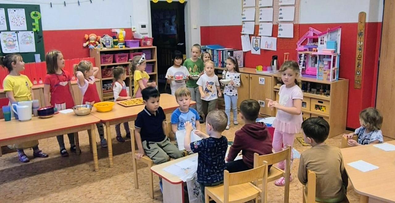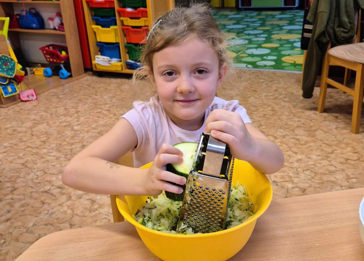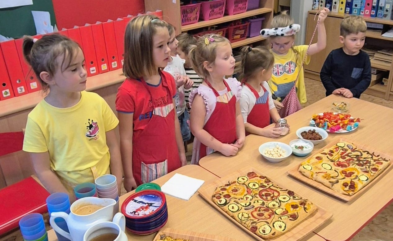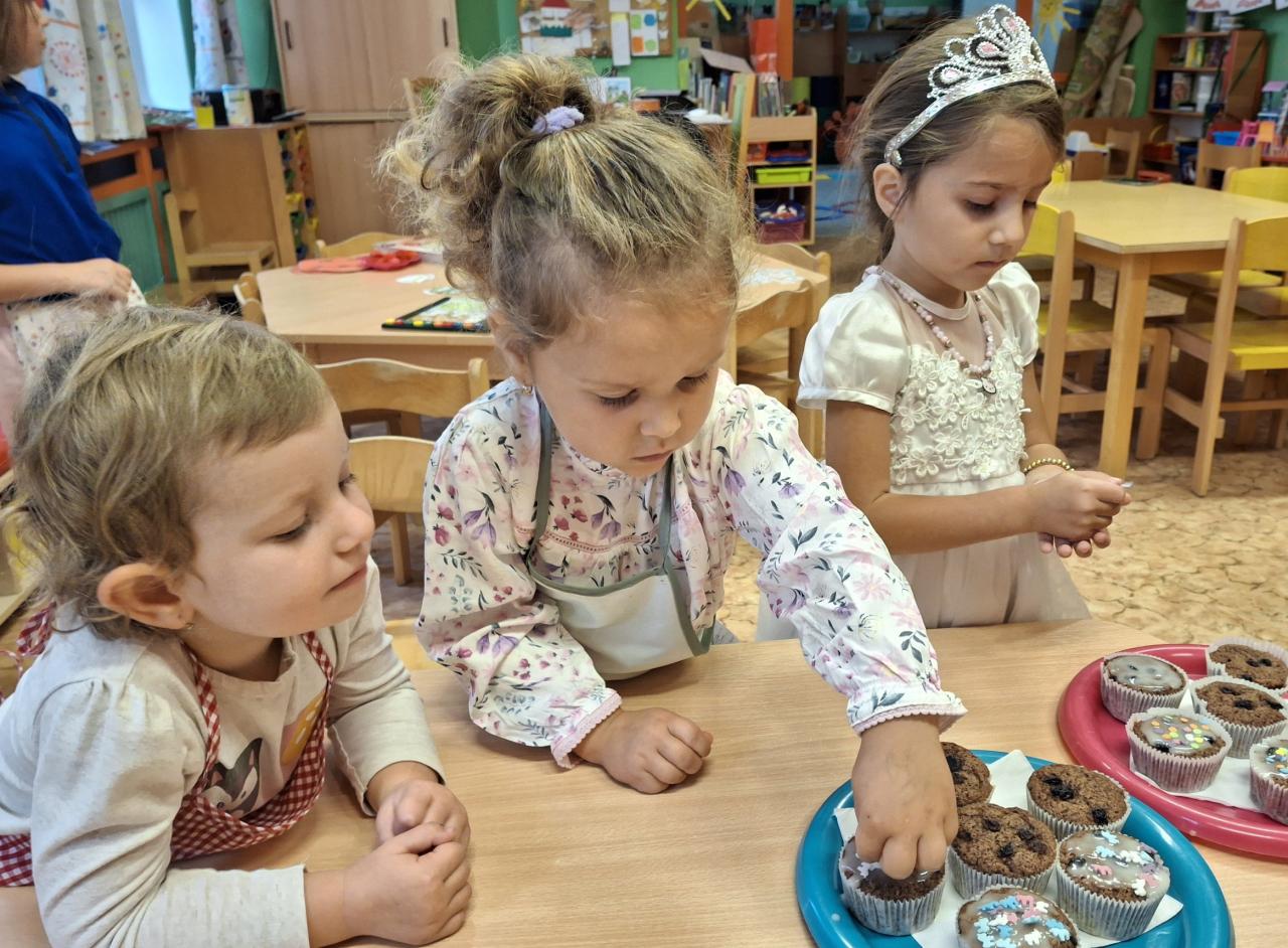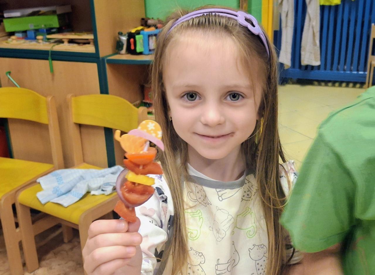 Zdravé bistro. Na občerstvení se velkou měrou podílely samotné děti. Loupaly, strouhaly, krájely, míchaly, zdobily. A nakonec ochutnávaly jablečné mufiny, jablíčkové šátečky, mandarinkový džus, ovocné i zeleninové špízy, zeleninové placičky, focaccia, brambůrky, sušená rajčátka, bylinkové dip. Obě akce si děti dost užily a nebyl nikdo, kdo by alespoň něco neochutnal.