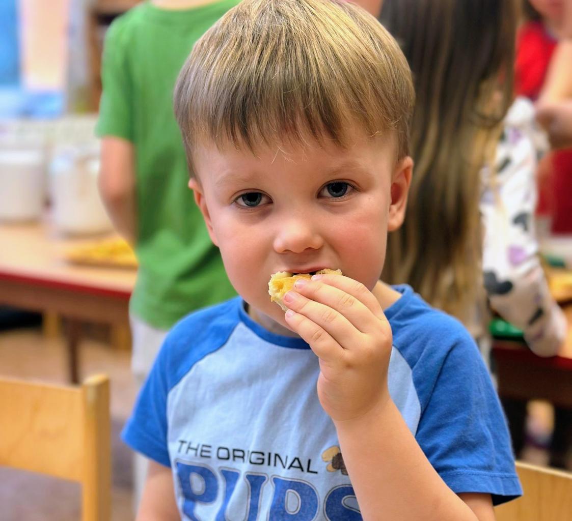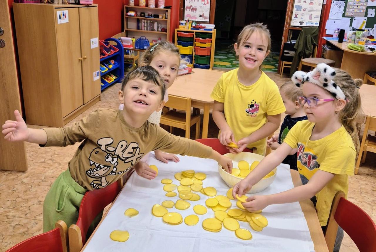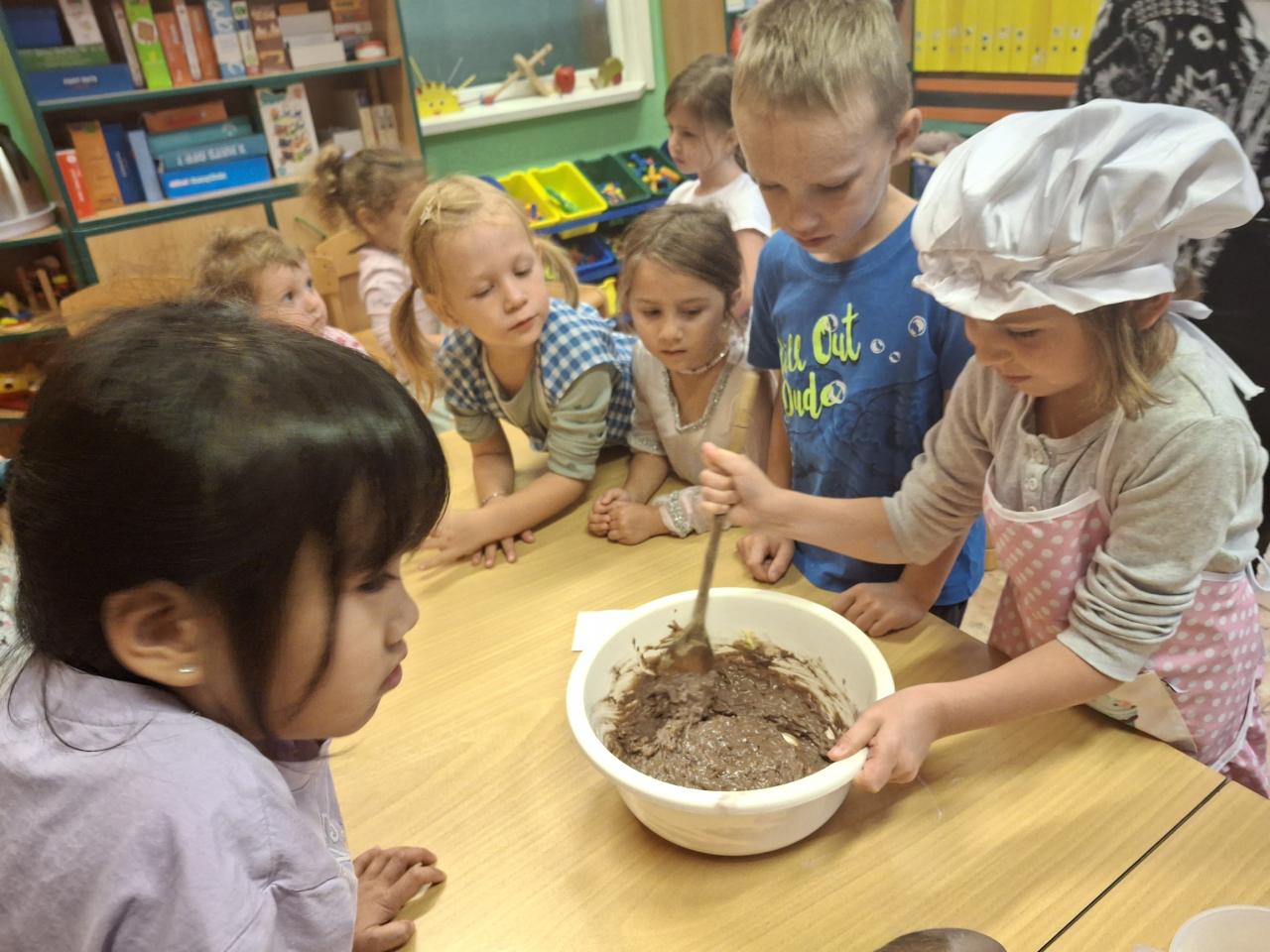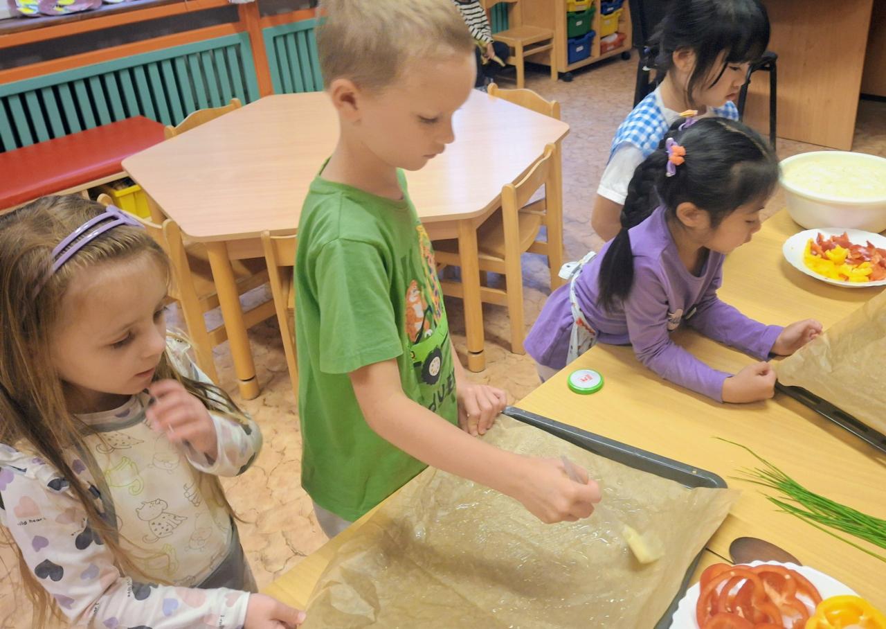 Zdravé bistro. Na občerstvení se velkou měrou podílely samotné děti. Loupaly, strouhaly, krájely, míchaly, zdobily. A nakonec ochutnávaly jablečné mufiny, jablíčkové šátečky, mandarinkový džus, ovocné i zeleninové špízy, zeleninové placičky, focaccia, brambůrky, sušená rajčátka, bylinkové dip. Obě akce si děti dost užily a nebyl nikdo, kdo by alespoň něco neochutnal.