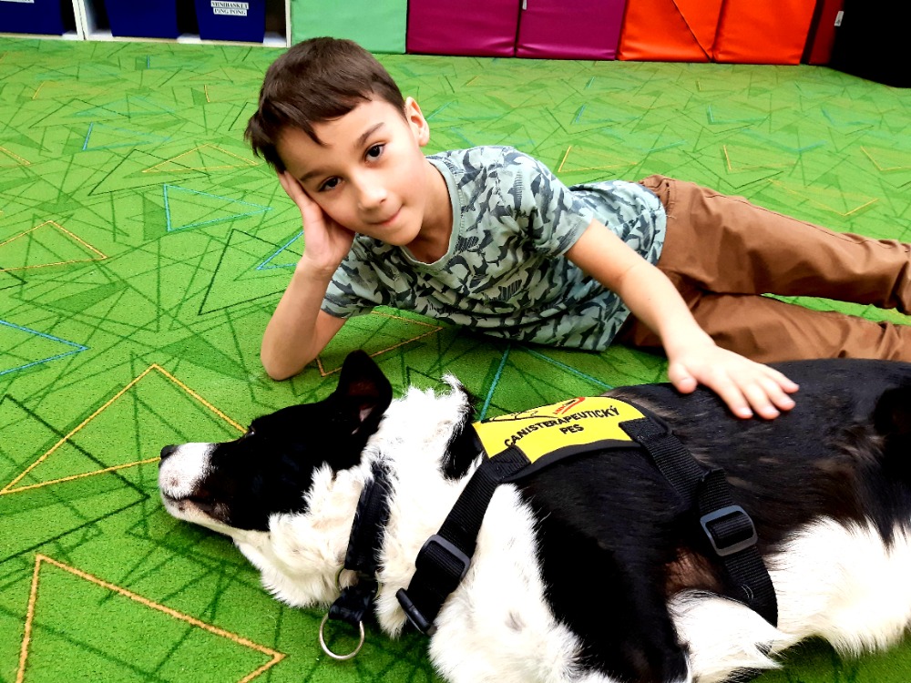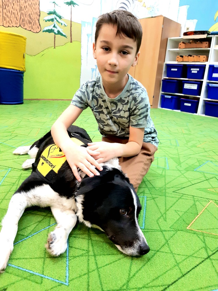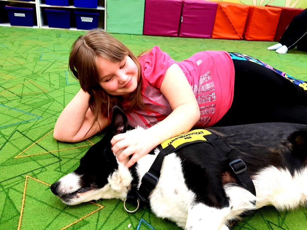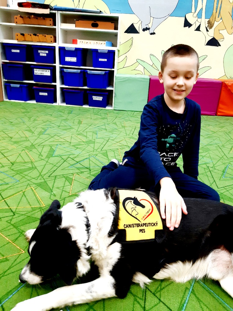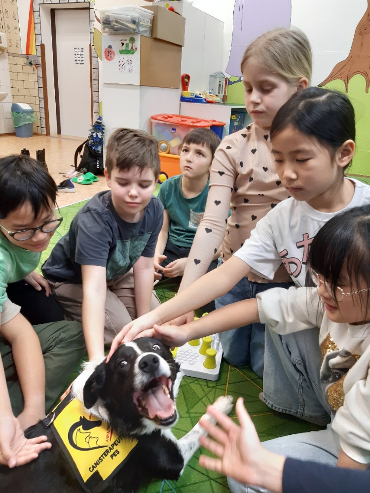 Border kolie Woody hravě zvládal základní povely - lehni, sedni, ke mně a spousty dalších.Nejvíce jsme se ale s dětmi těšily na povel Bang!, který známe z loňska.V ten moment si Woody postupně ke každému přilehl a nastala netrpělivě očekávaná chvíle hlazení a objímání s trpělivým zvířecím kamarádem. Pro některé děti to byl první přímý kontakt se psem, a takcanisterapeutický tým Woody a Hana Kalubová předvedli v praxi, co vlastně kontakt se zvířetem přináší. Uvolnění, pohodu a souznění, důvěru a pozornost a hlavně radost.