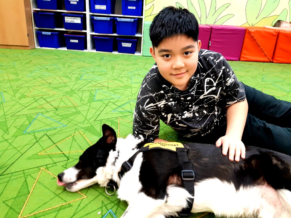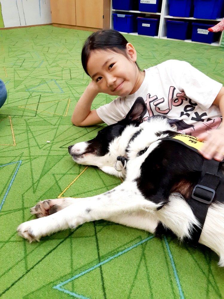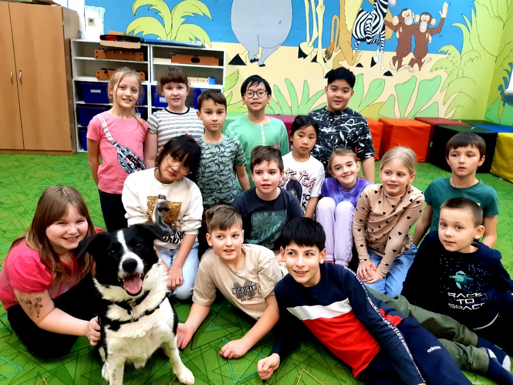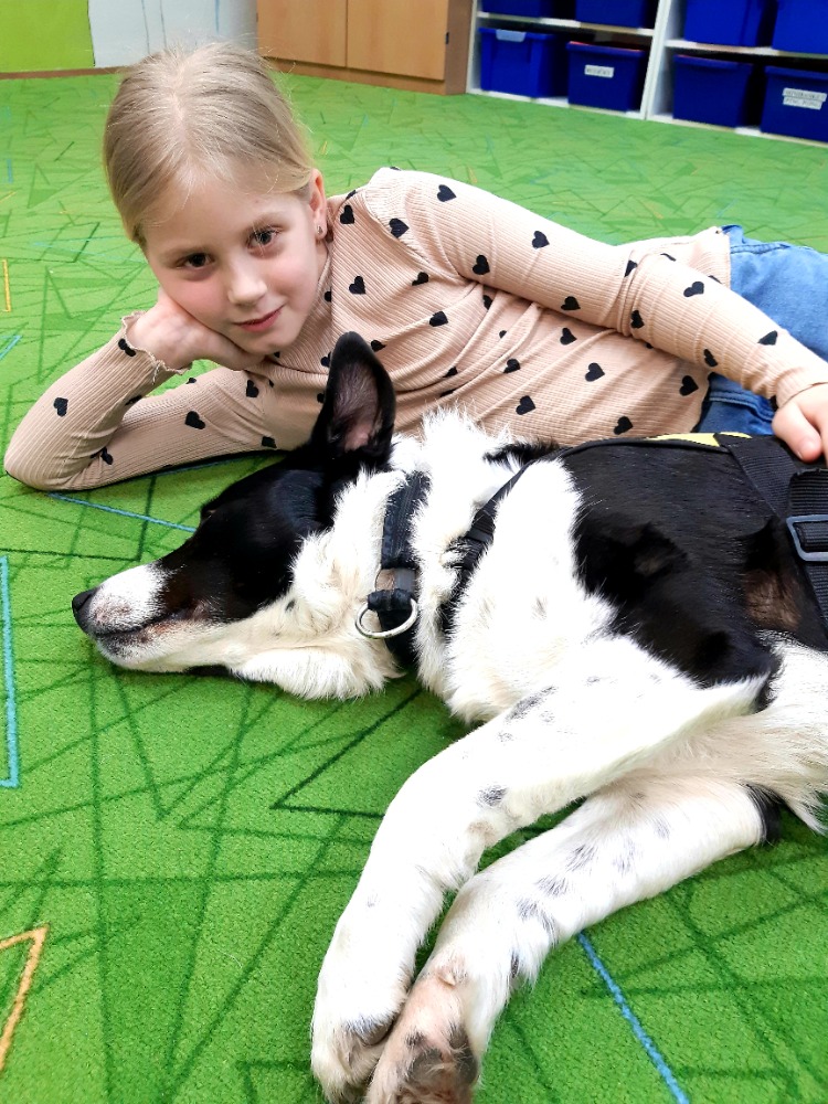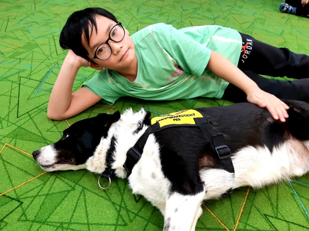 Border kolie Woody hravě zvládal základní povely - lehni, sedni, ke mně a spousty dalších.Nejvíce jsme se ale s dětmi těšily na povel Bang!, který známe z loňska.V ten moment si Woody postupně ke každému přilehl a nastala netrpělivě očekávaná chvíle hlazení a objímání s trpělivým zvířecím kamarádem. Pro některé děti to byl první přímý kontakt se psem, a takcanisterapeutický tým Woody a Hana Kalubová předvedli v praxi, co vlastně kontakt se zvířetem přináší. Uvolnění, pohodu a souznění, důvěru a pozornost a hlavně radost.